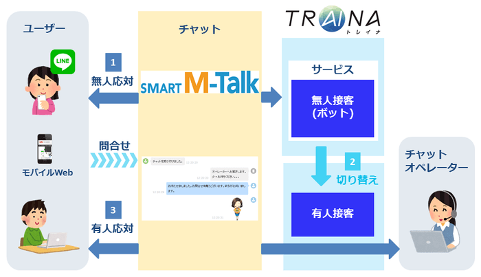 今回の連携により、LINEやWEBからの問い合わせに対し「TRAINA/トレイナ」による無人接客で窓口業務の効率化を図り、目的を絞り込んだ上で必要に応じて「Smart M Talk」の有人接客に引き継ぐことが可能となります。