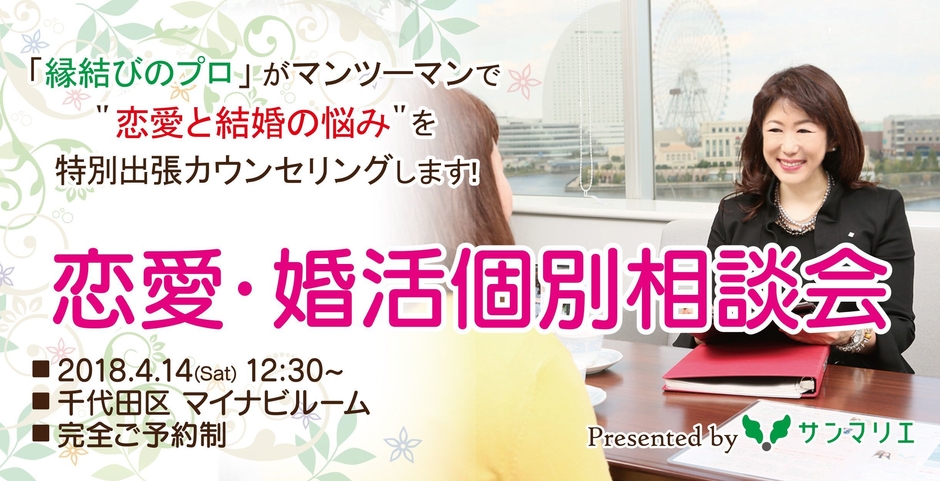 結婚相談所サンマリエ(運営:ハピライズ株式会社、本社:東京都新宿区、代表取締役:林順之亮)は、平成30年4月14日(土)12:30から「働く女性の『仕事』と『恋愛』を応援!恋愛・結婚個別相談会」を東京・千代田区のマイナビルームにて開催致します。