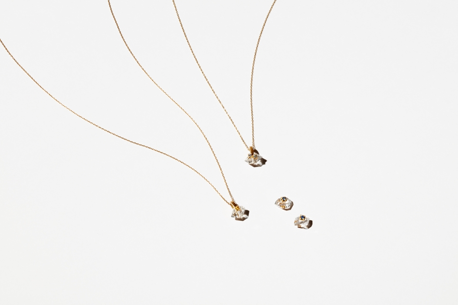 スリランカのラトゥナプラで採掘からカット・研磨に至るまで一貫して行われた、流通過程において透明性のあるサファイアをハーキマーダイヤモンドクォーツにあしらったジュエリーです。