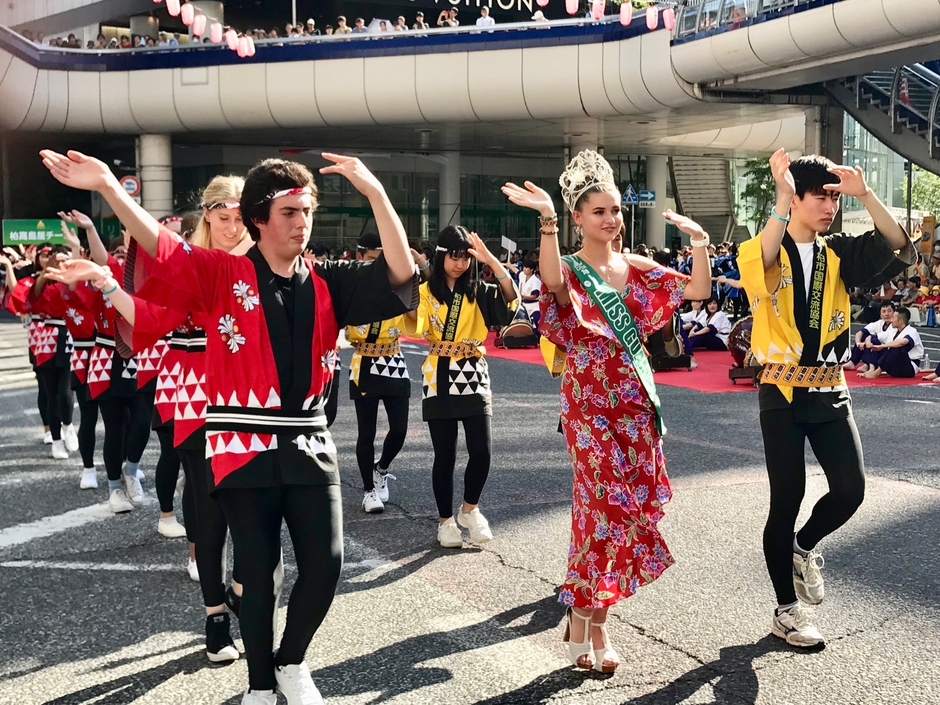 翌日27日にはグアム政府観光局の日本スタッフも含め総勢8名が、千葉県内でも大規模な祭りのひとつである柏まつりのオープニングセレモニー、テープカット式典、柏おどりコンテストに参加しました。毎年恒例の目玉イベント「柏おどりコンテスト」では、ミス・グアムが華やかなドレス姿で参加。グアム政府観光局が景品を提供するグアム友好賞はハクビ京都きもの学院柏校チームに授与されました。