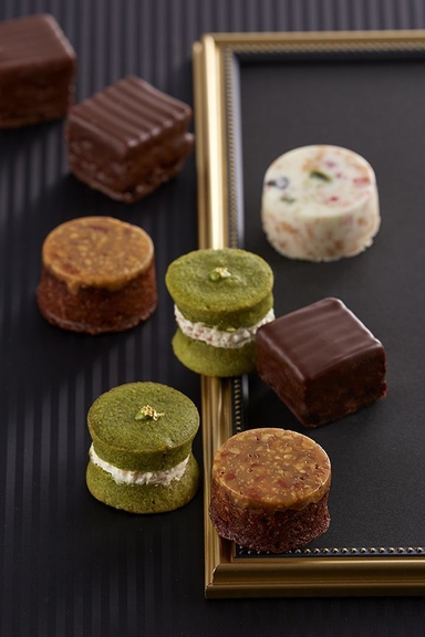 東京會舘伝統スイーツ、プティフールの季節限定版。チョコオレンジ、はちみつリンゴのパウンドと柚子抹茶、カシス、苺ミルク、のソフトクッキーの詰め合わせ。苺ミルクは苺クリームとコンフィチュールをしのばせました。