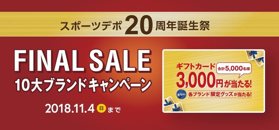 スポーツデポ20周年誕生祭FINAL SALE 「10大ブランドキャンペーン」10/5~11/4開催!!