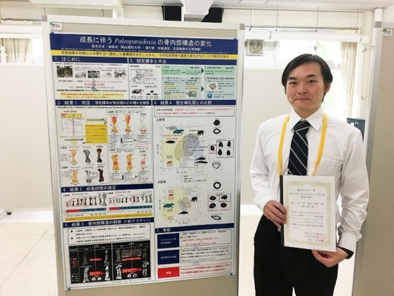 岡山理科大学(岡山市北区理大町)大学院生物地球学研究科修士課程2年の皆木大生(みなぎ・たいせい)さんが、わが国で最も権威ある化石の学会「日本古生物学会」の2019年会(6月21日~23日・静岡大学)で、最も優れた発表に贈られる「優秀ポスター賞」を受賞しました。