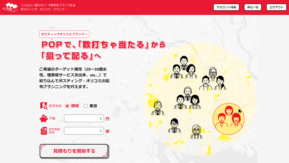 東日本最大級の新聞販売店である江崎新聞店グループの広告会社、株式会社静岡オリコミ(静岡市葵区、代表取締役社長:江崎 和明)は、コロナショック下でデリバリー・テイクアウトに取り組む飲食店など小規模の事業者でも簡単にポスティング・オリコミに取り組めるようにするため、Web広告のようにデータに基づいて「こんな人に配りたい」で配布計画を組め、Web上で発注できる「ポスティング・オリコミ・プランナー(略称 POP)」を2020年5月1日にWebページ上( https://posori-p.com )でリリースします。対応エリアは静岡県全域と東京都23区ですが順次拡大します。本サービスの開発はギルドワークス株式会社(東京都港区、代表取締役:市谷 聡啓)が行いました。本サービスは現在、特許出願中です。