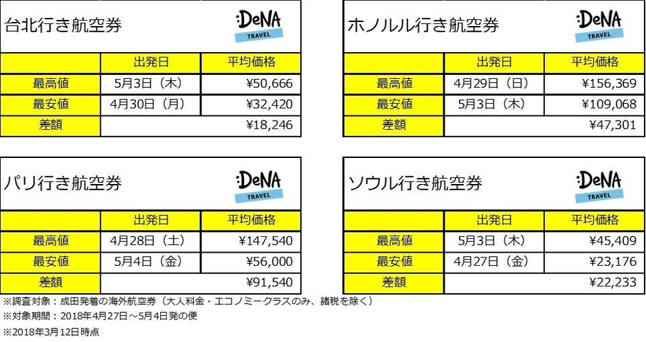2018年GW、ソウルや台北など近場は前半出発がお得! 同じゴールデンウィークでも場所によっては 値段が半額以下になることも! ~DeNAトラベルが2018年GWの混雑日とお得な出発日を調査~