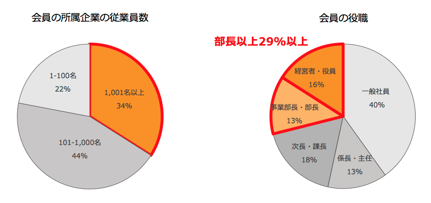 会員の役職は約3割が部長以上です。また従業員数が1,001名以上の企業に所属している会員が3割以上のため、大手企業の決裁者へのアプローチが可能です。