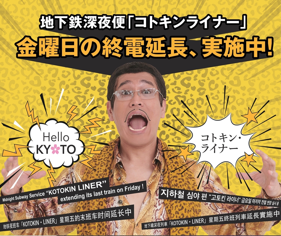 この度,国内外から高い人気を誇る「ピコ太郎」氏とのコラボレーションにより,京都市公式アプリ“Hello KYOTO”と京都市営地下鉄深夜便「コトキンライナー」のポスターキャンペーンを開始しましたので,お知らせします。
