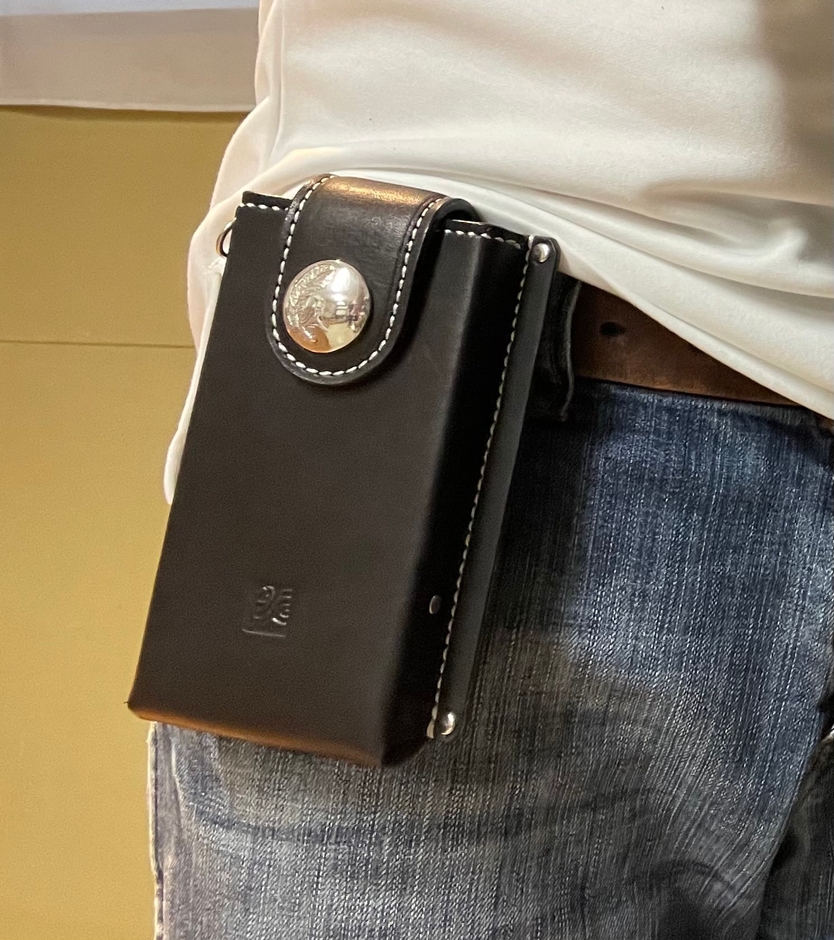 革を折り返してリベットで留めるだけのシンプル構造ですが、根付のように帯にしっかりと取り付けられ、取り外しも簡単です