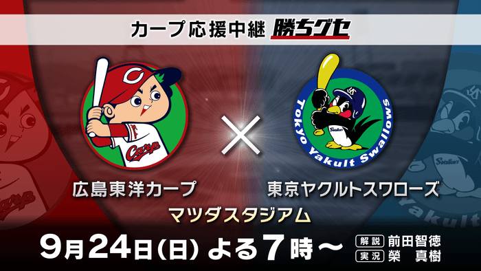 【カープ応援中継 勝ちグセ】CS進出にむけ2位を死守『ヤクルト戦』!!【広島ホームテレビ】カープ応援中継「勝ちグセ」9月24(日)よる7時~2023-09-19 12:00広島ホームテレビ広島ホームテレビ(HOME:本社・広島市中区)は、9月24日のよる7時から、カープ応援中継「勝ちグセ」を放送します。■放送予定カープ応援中継「勝ちグセ」「広島東洋カープ × 東京ヤクルトスワローズ」 【解説】前田智徳(HOME野球解説者)【実況】榮 真樹(HOMEアナウンサー)■カープ情報満載!こちらの番組もピタニューフロントドアカープ道画像・ファイル一覧一括ダウンロード