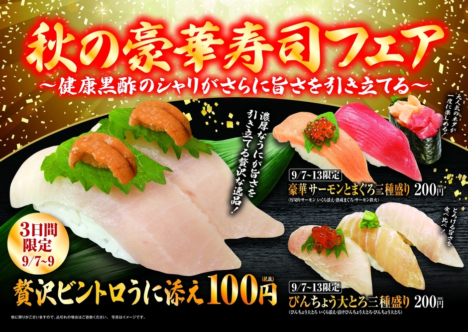 「贅沢&豪華」をテーマにした本フェアは、濃厚なうにをふんだんに使用した「贅沢ビントロうに添え」、大人気ネタのサーモンとまぐろが一度に楽しめる「豪華サーモンとまぐろの三種盛り」、脂の乗ったビンチョウマグロの食べ比べができる「びんちょう大とろ三種盛り」が登場します。
