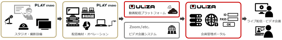 <ULIZA/PLAY>社外向け情報発信のための「ライブ配信ソリューション」は、セミナー・イベントのライブ配信などの様々な用途で利用可能なレンタルスタジオ、プロクオリティの撮影に対応する設備と機材、様々なライブ配信や収録の経験を積んだ専門スタッフによるオペレーション、双方向コミュニケーションが可能な企業向けビデオ会議システムZoomとの連携や高品質で安定したライブ配信、限定された視聴者へのライブ配信のための会員管理ポータルなど、オンラインでの決算説明会や記者発表会の実施を検討されている企業に向けたライブ配信のトータルソリューションです。