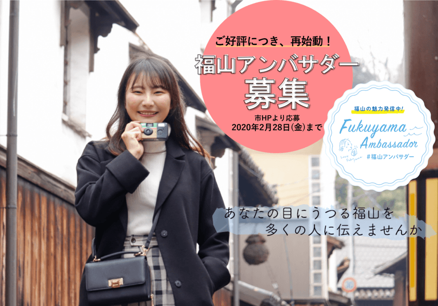 そこで福山アンバサダーは,2017年10月に活動開始し,2019年9月30日をもって活動の任期を終了としておりましたが,ご要望多数につき第2期福山アンバサダーのメンバーを募集します。新たに福山市出身の映画監督・中野裕之さんが理事を務める一般社団法人「ピース・ニッポン・プロジェクト」(東京)と連携し,ツイッターやインスタグラムで投稿した風景をインターネット上のサイトの地図上に表示させる取組を始めるとともに,企業や団体などのアカウントからも登録できるようにしました。第2期では,福山市立大学のフリーペーパーサークル「フォークロア制作」が加入し,一緒に福山アンバサダーを盛り上げていきます!