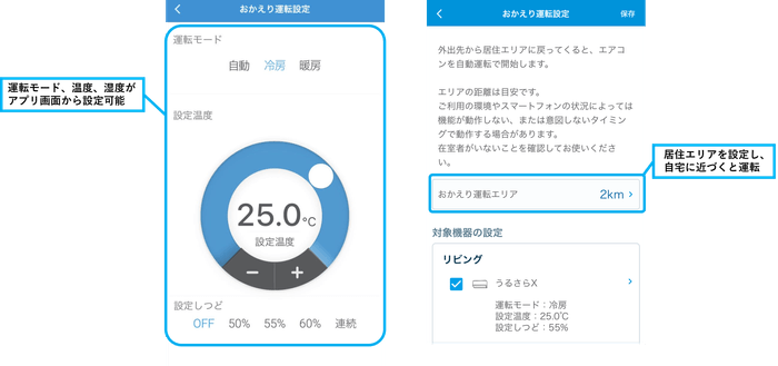 ・帰宅前に、予めアプリでお好みの温度と湿度に設定しておくことで、自宅に近づくと自動でエアコンが運転。お好みの温湿度で快適になったお部屋に帰ることができます(※自動運転での「おかえり運転」設定は、湿度のみが設定可能となります)。