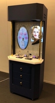 会話の内容はチャット形式でディスプレーに表示されるだけでなく、印刷された「バーチャル店員」の口が動いて音声が流れます。また、会話に合わせてお勧め商品の台部分が光るなど、高いアイキャッチ効果で店舗のプロモーションや販売促進に貢献します。