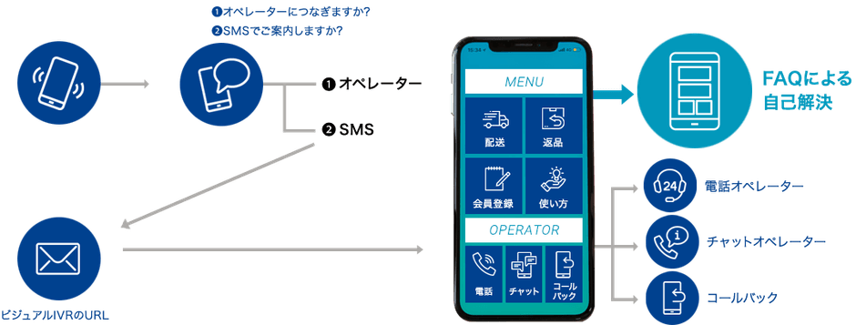 ビジュアルIVRとは、「IVR」(自動音声応答装置)を可視化し、スマートフォン上で簡潔にお問合せ内容を探し当て、お客様自身による問題解決を可能にするソリューションツールです。