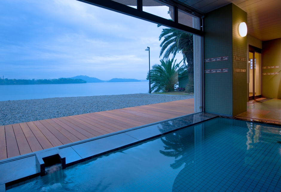 ホテルグリーンプラザ浜名湖の大浴場『憧憬の湯』は浜名湖を一望できる展望風呂。お風呂につかりながら眺める浜名湖の日の出は絶景です。また、湯船に入れた備長炭の働きでお湯が弱酸性になり、肌あたりのよい優しい感触が楽しめます。