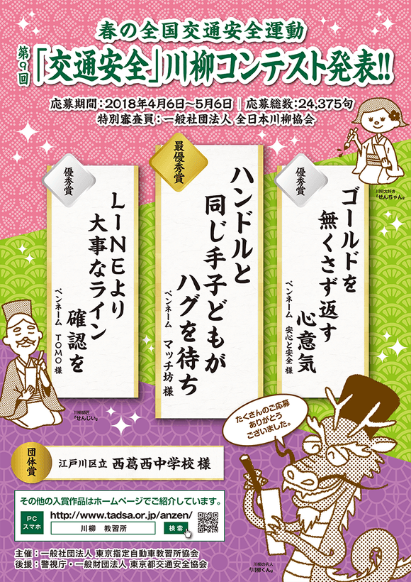 同コンテストは、春の全国交通安全運動の一環として交通安全の啓蒙を呼び掛けることを目的に、交通安全にまつわる川柳を、インターネット、葉書、都内の指定自動車教習所窓口で募集を行い、総数24,375句の作品が全国から寄せられました。