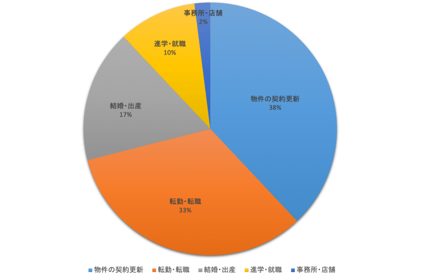 今回の集計では引っ越しの理由として、「住んでいる物件の契約更新」が一番多く、「更新」というシステムが引っ越しのきかっけを生んでいるという事実を浮き彫りにしました。