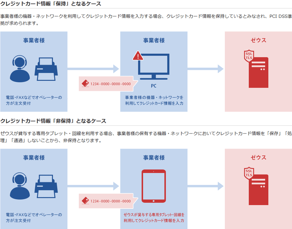 そこで、ゼウスでは従前より提供している非通過型の接続方式に加え、電話・FAX・申込書等で注文を受け付けてクレジットカード決済を行うEC・通販事業者様向けに、現在の運用を大きく変更することなくクレジットカード情報の非保持化を実現する「タブレット端末レンタルサービス」を提供することといたしました。