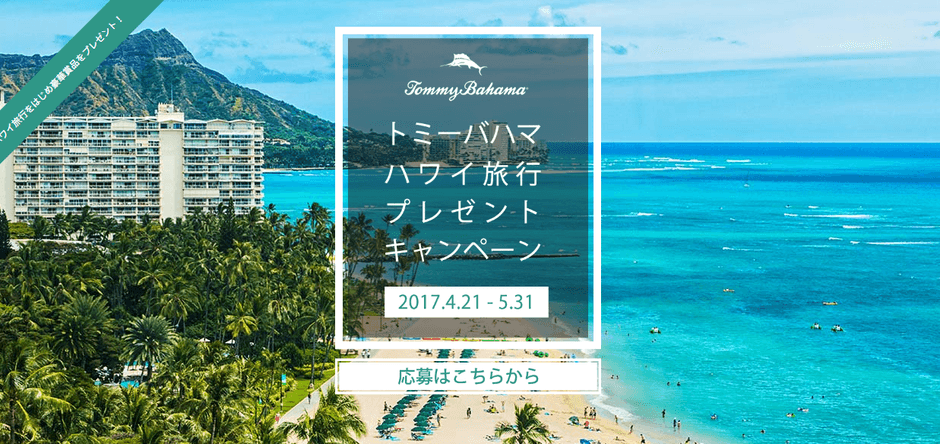 Make life one long weekend(日々を長い週末のように)をブランドコンセプトに、衣料品や雑貨、レストランを展開するトミーバハマが4月21日(金)~5月31日(水)までの期間中、ハワイを感じるさまざまな賞品をセレクトしてオープン懸賞を実施いたします。