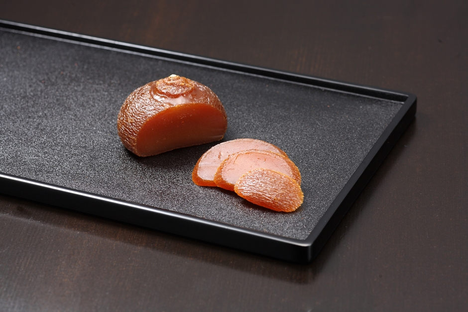 丸柚餅子は、そのまま薄切りにしてお茶うけとして召し上がっていただくほか、日本料理では茶碗蒸しやお吸い物の椀だねとしてお使いいただいております。柚子の香りと苦みに甘さがとけあう味わいを活かし、天ぷら、おひたし、和えもの、酢のもの等にもアレンジしていただいております。
