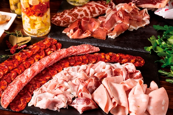 レストランに入るとまず目を引く大きな特製テーブルには、シェフが厳選し取り寄せた生ハムやチョリソーが所狭しと並んでいます。それぞれのハムやチョリソーをグラム単位でオーダーできるほか、色々なハムが食べられるセットメニューをオーダーすることも可能です。中でも一番のおすすめは「セラーノハム」(700円 税・サービス料別/10グラム)。18か月以上熟成させた骨付きの生ハムは、まろやかな塩気とコクのある味わいが特徴です。このフェアのために用意されたスペインワインとの相性は抜群です。