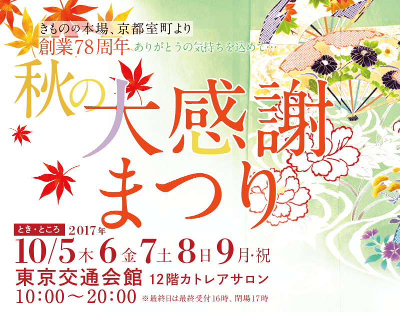 株式会社京都きもの市場(所在地:京都市中京区、代表取締役社長:田中 敬次郎)は、2017年10月5日(木)~9日(月・祝)に、東京交通会館 12階 カトレアサロン(東京・有楽町)にて、きもの展示会「創業78周年 秋の大感謝まつり」を開催いたします。