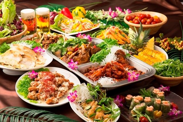 ソフトシェルのチリクラブをはじめ、シンガポール料理を中心としたアジアンフード、鶏モモ肉のニョニャマヨネーズ、小エビと春雨の生春巻き、牛肉炒めのポリネシアンソースなど30種類以上をご用意。