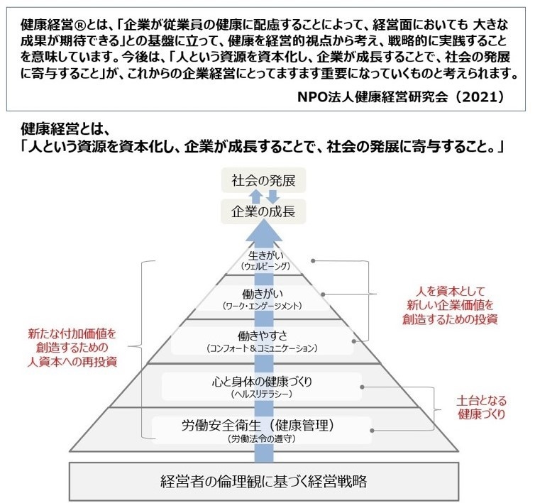 ・しかし、これからの健康経営を、より時代に合った経営戦略に進化させていくためには、健康経営を「人という資源を資本化し、企業が成長することで、社会の発展に寄与すること」として捉え、人という無形資産への戦略的投資として積極的に推進していくことが求められると考えています。