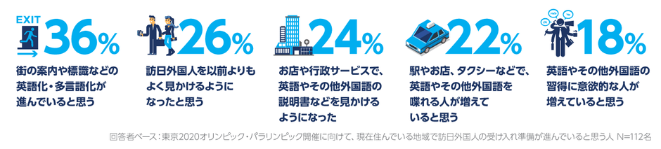 なお、訪日外国人の受け入れに関して、回答者自身が何らかの取り組みをしている人は26%に留まりました。「特になし」という回答が全体の74%を占め、個人レベルでの受け入れ準備も進んでいないことが分かりました。