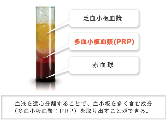 PRPとは、自己血を遠心した後の血小板を多く含む血漿層のことです。