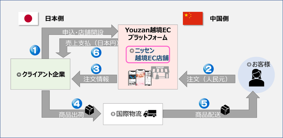 今回の業務提携により、ニッセンBtoBは中国最大手のソーシャルECプラットフォーム「Youzan」(有賛)を活用し、中国市場にて越境EC店舗を開設。Youzan Japanと共同で店舗を運営し、コンソーシアム型越境ECとして、年間1,000社以上の取引がある国内企業に対して、新たなソリューションサービスとして中国市場への進出及び販売サポートを開始します。また人気ライバーによるライブ配信やSNSなど豊富な販路開拓チャネルを活用したプロモーションなど、中国参入を目指す企業を全面支援して参ります。