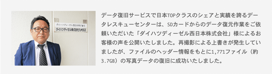 データ復旧サービスで日本TOPクラスのシェアと実績を誇るデータレスキューセンターを運営する株式会社アラジン(本社:福岡県福岡市/代表取締役:長濱 慶直)は、SDカードからのデータ復元作業をご依頼いただいた「ダイハツディーゼル西日本株式会社」様によるお客様の声を公開いたしました。再撮影による上書きが発生していましたが、ファイルのヘッダー情報をもとに1,771ファイル(約3.7GB)の写真データの復旧に成功いたしました。