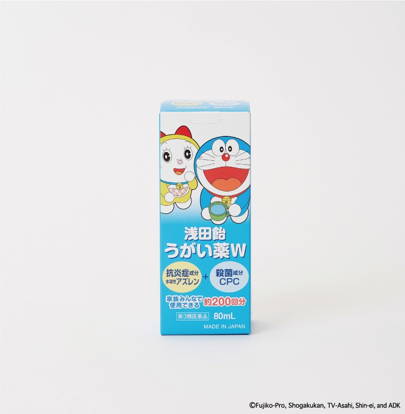 幅広い年代から愛される「ドラえもん」をパッケージに起用したドラえもんシリーズは、2015年に乗り物酔い薬「トラベロップQQ」(第2類医薬品)を発売して以来大変ご好評いただいており、今回の「浅田飴うがい薬W」で6品目となります。