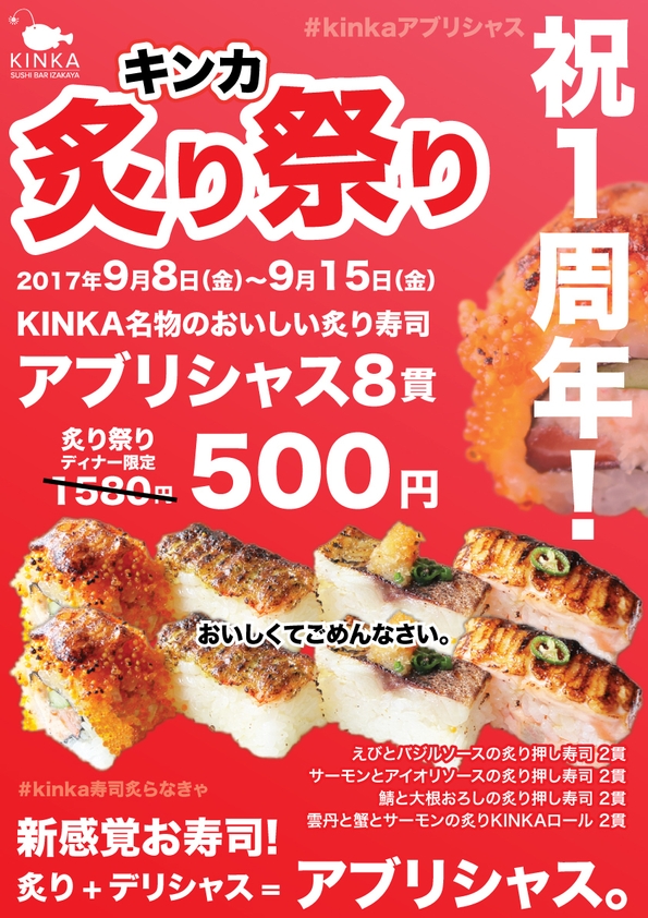 このたび、2017年9月15日に1周年を迎えるKINKAはお客様・業者様・関係者様・関わる全ての方への感謝の気持ちを込めて『炙り祭り』を開催します。