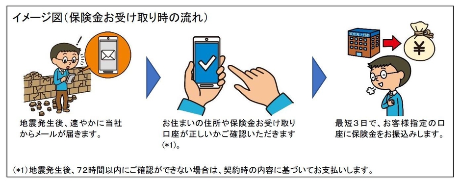 ●家屋等の損害状況の確認が不要であり、観測された震度に応じて保険金をお支払いするため、地震発生から最短3日で保険金を受け取ることができます。