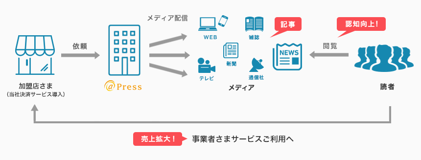 「@Press」は、広報のプロフェッショナルがプレスリリースの原稿校正や案件に合った最適な配信先メディアリストの選定により、「日本で1番記事になる※3」を実現しているプレスリリース配信サービスです。加盟店さまは「マーケティング支援無償プラン」を利用しプレスリリースを通じて情報発信することで、新聞、テレビ、Webメディアをはじめとする各種メディアでの記事掲載の可能性が高まり、商品、サービスなどの認知度アップや売上拡大につなげることができます。また、加盟店さまのプロモーション活動を継続的にサポートしてくために、プレスリリースの書き方セミナーなどを順次開催してまいります。