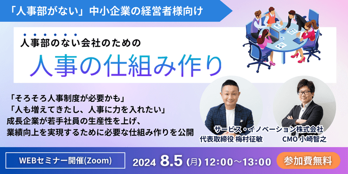 成長期・変革期を迎える中堅・中小企業に特化した組織作り・組織強化支援を行うサービス・イノベーション株式会社(本社:神奈川県川崎市、CEO:梅村 征敏)は、2024年8月5日(月)12:00~13:00に『「人事部のない会社」のための人事の仕組み作り ~人事機能を強化して戦略の実行力を改善するポイント~』を開催することをお知らせいたします。