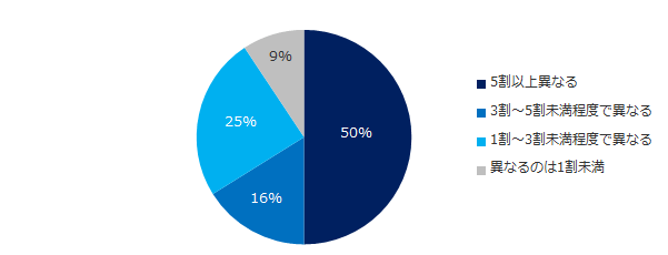 「転職者が企業に伝える転職理由と本当の転職理由が異なるケースはありますか?」と伺うと、半数が「5割以上異なる」と回答。2人に1人の転職者は、本当の理由を企業に伝えていないことが分かりました。