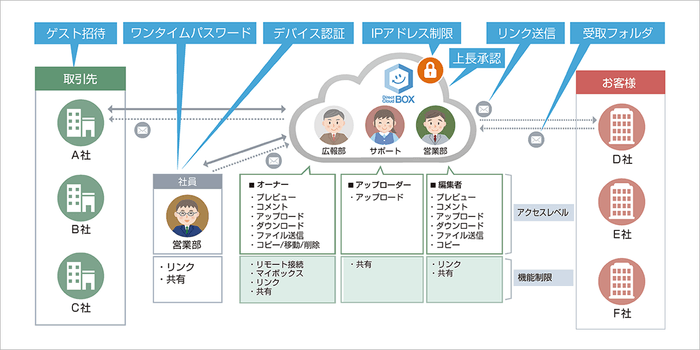 「DirectCloud-BOX フリー」なら、部署ごと・ユーザーごとにアクセス権を付与し、任意のフォルダのみにアクセスさせることができます。昨今需要の高いテレワーク時も、ワンタイムパスワードを発行し、セキュアなアクセスが可能です。またファイルを頻繁にやり取りする取引先をゲスト招待し、通知メールやファイルコメントでスマートかつ簡単に情報共有ができます。メール添付をせずにリンクを使ったファイルの受け渡しも可能なので、情報漏洩対策としてもオススメできます。