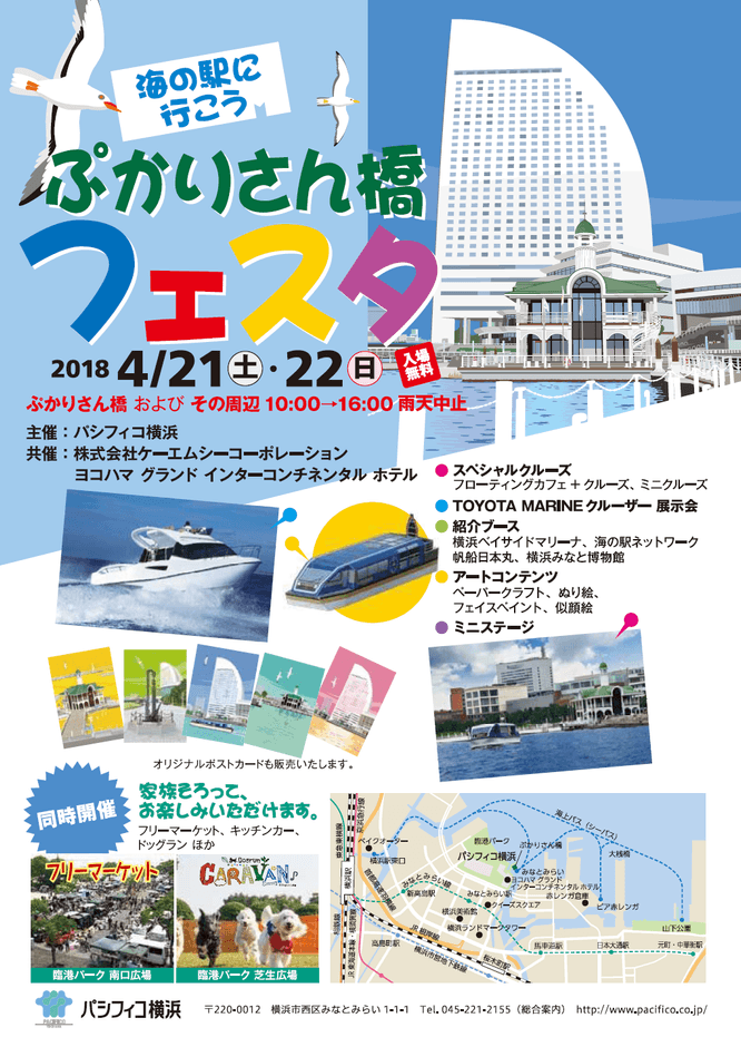 パシフィコ横浜(正式名称:株式会社横浜国際平和会議場、所在地:横浜市西区、代表取締役社長:鈴木 隆)は、株式会社ケーエムシーコーポレーション(所在地:横浜市西区、代表取締役:熊澤 喜一郎)とヨコハマ グランド インターコンチネンタル ホテル(正式名称:株式会社横浜グランドインターコンチネンタルホテル、所在地:横浜市西区、代表取締役社長:梅村 東)を共催として、2018年4月21日(土)~4月22日(日)の2日間、『ぷかりさん橋フェスタ』を開催します。