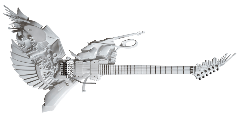 Rella氏の描いた初音ミク16周年のメインビジュアルに描かれている「創作の羽根」をモチーフにしたギターを製作するべく「創作の翼プロジェクト」がESP内に立ち上がりました。デザインの原型はあるにせよ、本来のギターとしての機能を損なうことなくプレアビリティも確保しながら実用性を踏まえて再構築し、ギターとしての完成度はいわずもがなですが、造形物としての完成度も高い「創作の翼 -Wings Of Creation」は完成しました。