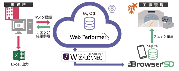 このような背景のもと、佐藤工業様はさらなる作業品質の向上と効率化を目指して、ペーパーレスの品質チェックシステム「健コンカルテ」を開発されました。開発プラットフォームとして『Biz/Browser SmartDevice』、『Web Performer』、そして『Wiz/CONNECT』を採用したことにより、画面構築やAPI連携部分の開発の工数が大きく削減され、プログラミング実装とテスト完了まで2018年4月~6月の3ヶ月間という驚異的なスピードで実施できました。