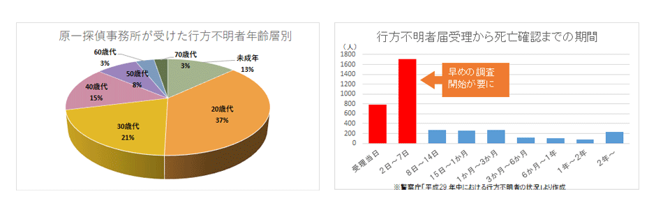 実際に平成29年度の警察庁の発表でも1年間で行方不明者届受理後に死亡が確認されたのは、受理2日~7日後が群を抜いて多いことが分かっています。自殺だけが死亡原因とは言えなくとも、「人探し調査開始」が早ければ早いほど、命が守られるといっても過言ではありません。