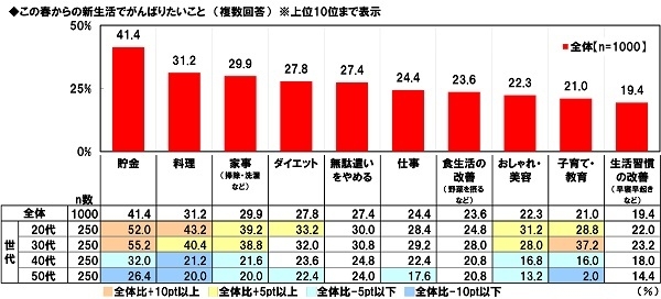 全国の20~59歳の女性(全回答者:1,000名)に、この春(4月)からの新生活でがんばりたいことを聞いたところ、「貯金」(41.4%)が最も高く、次いで、「料理」(31.2%)、「家事(掃除・洗濯など)」(29.9%)、「ダイエット」(27.8%)、「無駄遣いをやめる」(27.4%)となりました。