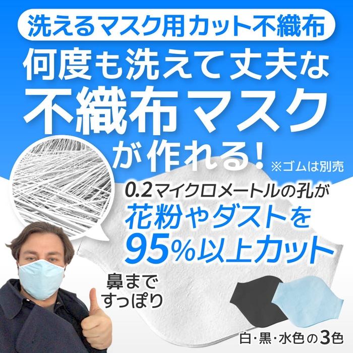 手作りマスク用不織布ですので、縫い方によって顔との密着性を保てなかった場合は、顔との隙間からウイルスが入ってしまう可能性もあります。本製品の指示どおりにゴムを縫っていただけますようお願いします。