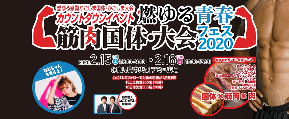 燃ゆる感動かごしま国体・かごしま大会鹿児島市実行委員会は、いよいよ今年48年ぶりに鹿児島県で開催される「燃ゆる感動かごしま国体」(第75回国民体育大会)と本県初開催の「燃ゆる感動かごしま大会」(第20回全国障害者スポーツ大会)を控え、若年層をターゲットにさらなる開催機運の醸成を図るため、「筋肉」と「お肉」をテーマにしたカウントダウンイベントを2月15~16日に開催します。