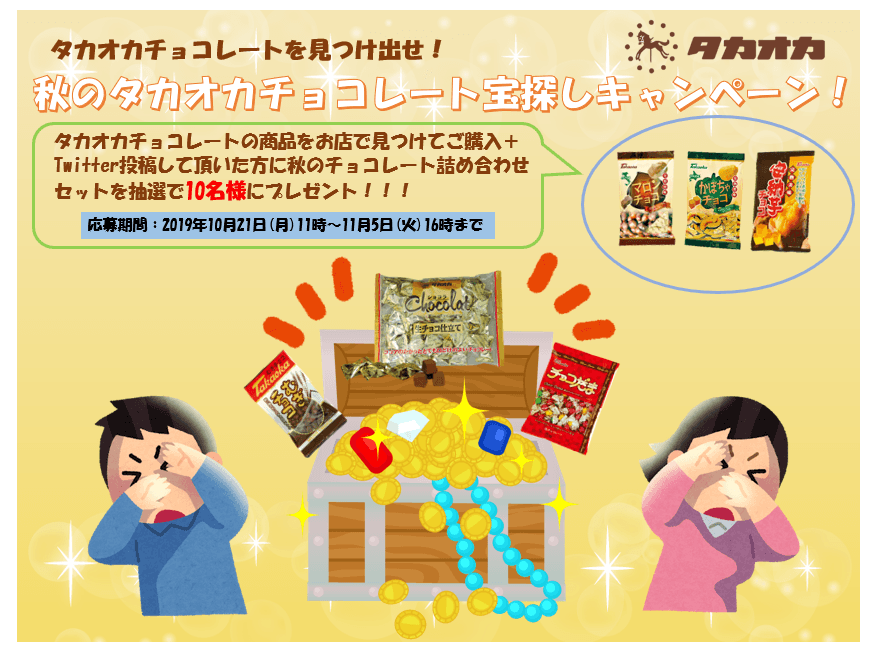 高岡食品工業株式会社(本社:兵庫県尼崎市、代表取締役社長:松田 順子、以下 タカオカ)は、2019年10月21日から同11月5日までの間、タカオカチョコレートの商品を実店舗で発見・ご購入頂きTwitterに写真を投稿して頂いた方の中から抽選で10名様に、秋の味覚のチョコレート詰め合わせセットをプレゼントする「タカオカチョコレートを見つけ出せ!秋のタカオカチョコレート宝探しキャンペーン」を開催致します。