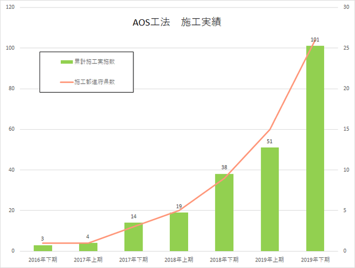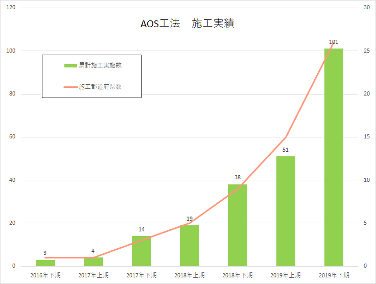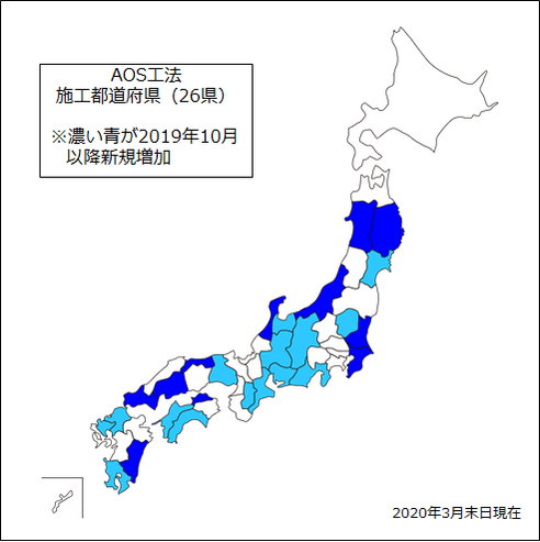 2020年3月31日出荷分までの都道府県別施工実績においても、26県にまで増加し、AOS工法の革新性は全国規模で高く評価されていることが示されています。