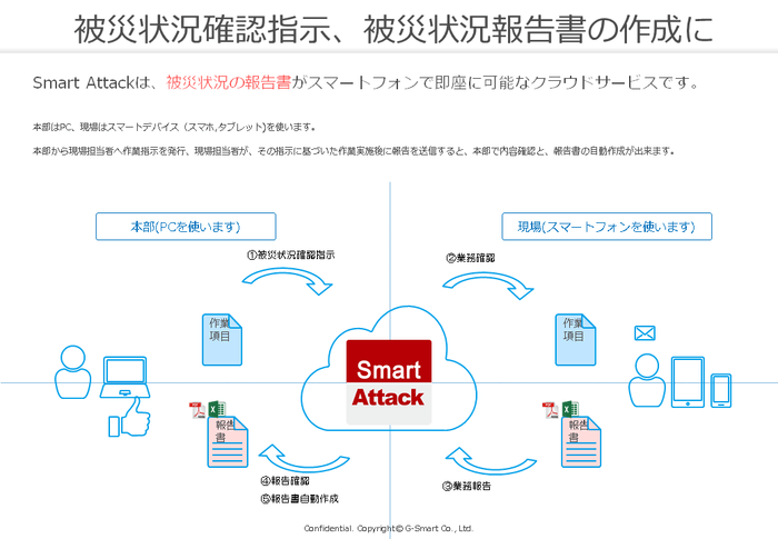 株式会社G-Smart(本社:東京都台東区、代表取締役社長:本垰 和孝、以下 G-Smart)は、「令和2年7月豪雨」をうけ、被災状況報告書や復興作業確認書などを迅速に作成可能な現場報告アプリ『Smart Attack』を、復旧復興に携わる公共機関、被災地企業、ボランティア団体向けに無償提供すると発表いたしました。